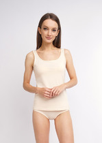 Горловина и проймы окантованы бейками из основного полотна переходящими в бретель.