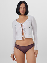 Интригующие трусики-бразилиана из элегантного кружева. Посадка по талии – чуть занижена. Декор в виде тонких тесемок и миниатюрного бантика делает эту модель максимально необычной и женственной.
