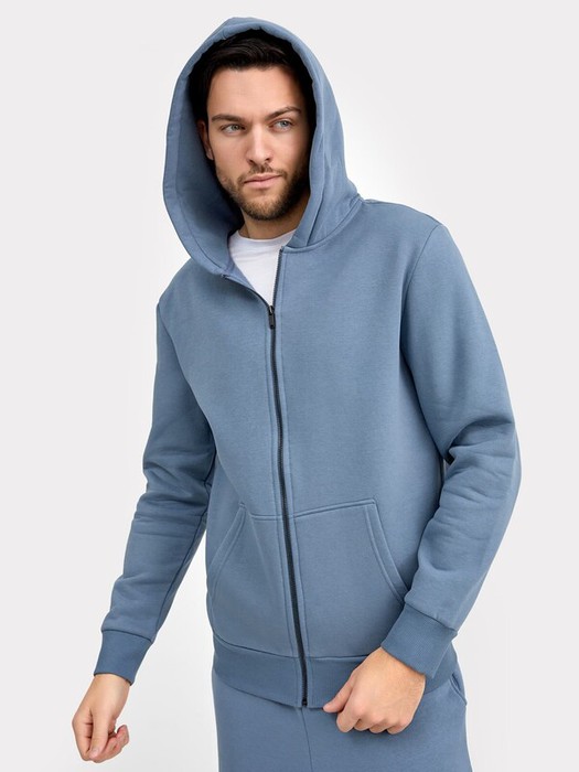 Однотонная мужская толстовка из трикотажного футера с подчесом. Удобный карман-кенгуру, спущенная линия плеча и углубленная пройма, длинные рукава, уютный капюшон, центральная застежка на молнию – ничего лишнего!