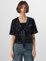 Жакет женский, выполнены из трикотажного полотна велюр с пайетками. Жакет прямой, свободный, укороченный. Горловина V-образной формы. Рукава втачные, длиной до локтя. Жакет на подкладке из сатина. По переду завязки из репсовой ленты на бант.
