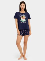 Комплект женский состоит из рубашки и шорт. Рубашка свободного силуэта, с отложным воротником. Рукав втачной короткий, линия плеча немного спущена, рукав обработан вподгибку. Рубашка с центральной застежкой с петлями и пуговицами. Низ застрочен швом в подгибку.