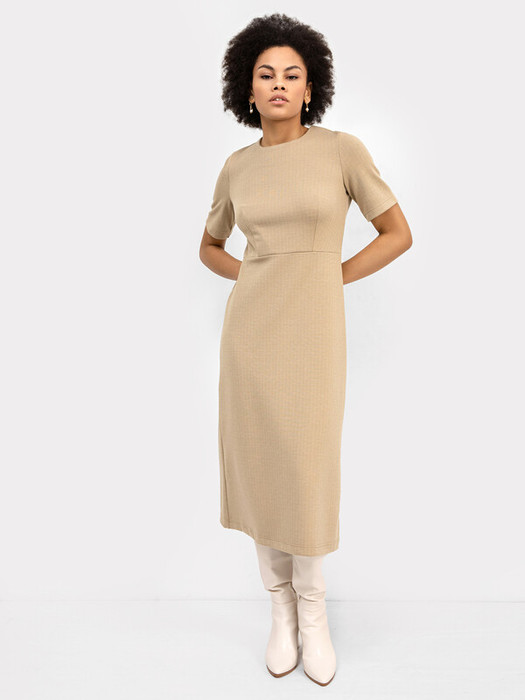 Платье женское прилегающего силуэта из трикотажного полотна академик. На детали переда и спинки вытачки от талии. Спинка со средним швом и потайной молнией и разрезом по низу. Горловина круглой формы, обработана обтачкой из основного полотна. Рукав втачной, по локоть.