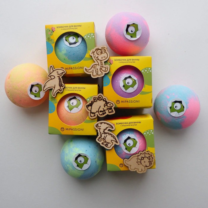 Внутри бомбочки ожидает сюрприз. Это деревянная игрушка, которую после купания можно высушить и раскрасить. Яркие краски бомбочки окрашивают только воду, не оставляя следов на коже и ванне.