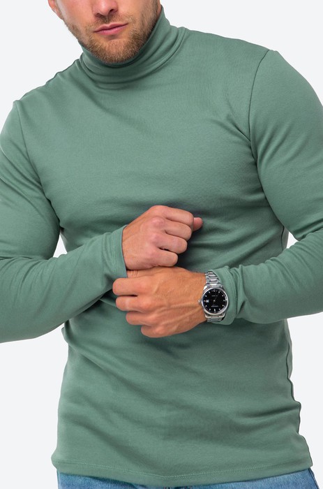 Базовая водолазка светло-зеленого цвета из мягкого и приятного к телу хлопка для мужчин – сочетание стиля и комфорта на каждый день. Высокий ворот, длинные рукава и насыщенный цвет – главные составляющие идеальной мужской модели для этой осени.