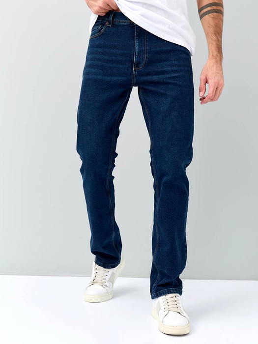 Мужские классические джинсы с пятью карманами. Посадка Regular fit (полуоблегающие по бедру), высокая талия. Застежка на молнии. Зауженные к низу.  Выполнены из слабоэластичной ткани denim comfort stretch. Средняя стирка с  потёртостями и "усами" спереди и потёртостями сзади.