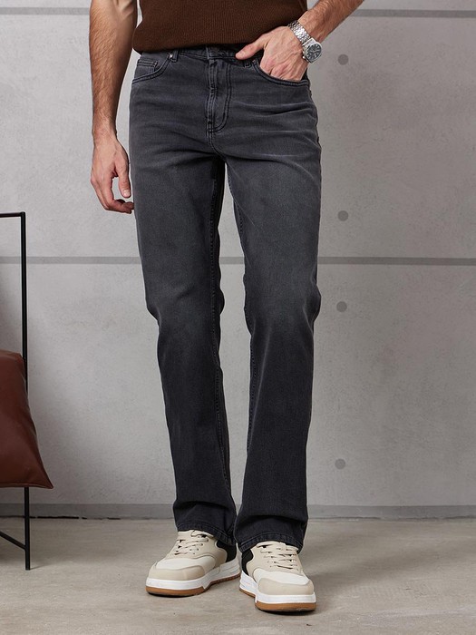 Мужские классические джинсы с пятью карманами. Посадка Regular fit (полуоблегающие по бедру), высокая талия, немного заужены к низу. Застежка на молнии. Выполнены из слабоэластичной ткани denim comfort stretch, цвет ткани Black/Black (лицевая и изнаночная стороны ткани черные). Темная стирка с потёртостями и "усами" спереди и потёртостями сзади.