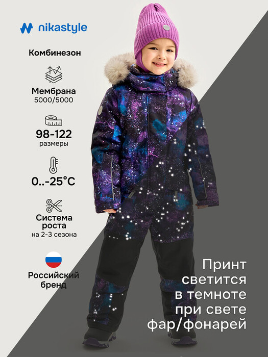 Комбинезон ВСЕЛЕННАЯ с системой роста на один размер (длина рукавов и брючин увеличивается на 4-5см).Комбинезон из мембранной ткани 5000/5000 с водо-грязеотталкивающей технологией TEFLON. Мембранная ткань это не продуваемый и водонепроницаемый материал, который надежно защищает от ветра и влаги. Благодаря дышащим свойствам мембраны ребенку будет комфортно в любую погоду, и он не вспотеет. Дополнительно на ткань нанесен светоотражающий принт. Ткань обработана снаружи экологически чистым протектором TEFLON для защиты от воды и грязи. Мембрана в сочетании с утеплителем нового поколения FIBERlite сохраняет тепло во время прогулок, позволяя телу дышать.  Флисовая подкладка отводит влагу и имеет хорошие теплоизоляционные свойства. Функционал: - центральная застежка и карманы на молнии, - ветрозащитная планка, - съемный капюшон на молнии, - кулиса для регулировки объема по капюшону и по талии, - внутренние бретели для возможности снять верхнюю часть изделия в помещении.  Мы все продумали до мелочей, поэтому модель дополнительно оснащена:- трикотажными манжетами в рукавах, - снегозащитными муфтами на брючинах, - силиконовыми штрипками, - флисовой подкладкой до середины бедра, - светоотражающими элементами для безопасности ребенка в темное время суток.  Область колен и шов сидения проклеены, места повышенного трения выполнены из усиленной ткани, Комфортная температура эксплуатации от 0°С до -25° С. Рекомендуем приобрести комплектом аксессуары, обувь и другие вещи из капсулы в карточке товара, которые отлично сочетаются с изделиями коллекции.