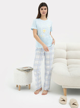 Сорочка женская из трикотажного полотна «кулирка» с набивным рисунком, свободного покроя, расширенная книзу, с короткими рукавами «реглан», овальной горловиной, окантованной основным материалом. Полочка, спинка и рукава присборены по горловине. Низ изделия и нижние срезы рукавов обработаны узким кружевом.