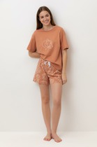 Сорочка из гладкокрашеного вискозного трикотажного полотна, слегка расширенная книзу, с короткими втачными рукавами. Полочка и спинка – с V – образными кружевными деталями по горловине.