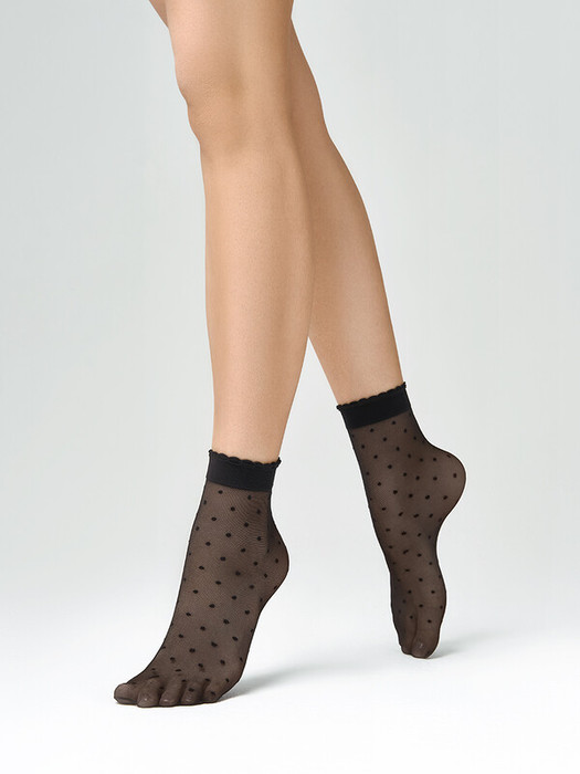 Женские фантазийные эластичные носочки с рисунком «горошек». Удобная резинка комфортно облегает, а невидимый мысок позволяет сочетать носочки с босоножками и открытыми туфлями.
