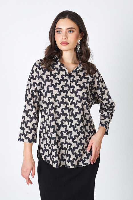 Блуза-рубашка свободного силуэта с застёжкой на пуговицы из вискозной ткани. Низ изделия с закруглениями по бокам. Втачной рукав в спущенную пройму. Вырез горловины обработан отложным воротником на стойке. На задней части изделия выполнена кокетка с небольшой складкой. Достоинство этой модели - в способности скрыть некоторые недостатки фигуры.