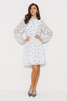 Платье отрезное по линии талии из плательной ткани. Изделие, прилегающее в области груди и свободное в области бедер. Глубокий V-образный вырез горловины плавно переходит в запах, фиксируется притачным поясом. Короткий рукав - крылышко.