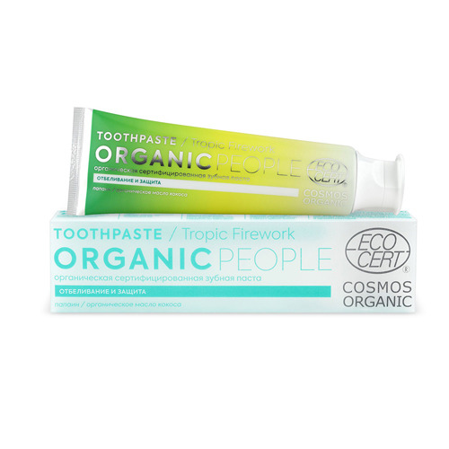 Органическая сертифицированная зубная паста Organic People "Tropic firework", отбеливание и защита абсолютно безопасна, так как не содержит опасных для здоровья химических компонентов: SLS, SLES, парабенов, хлоргексидина, диоксида титана, искусственных красителей и ароматизаторов.