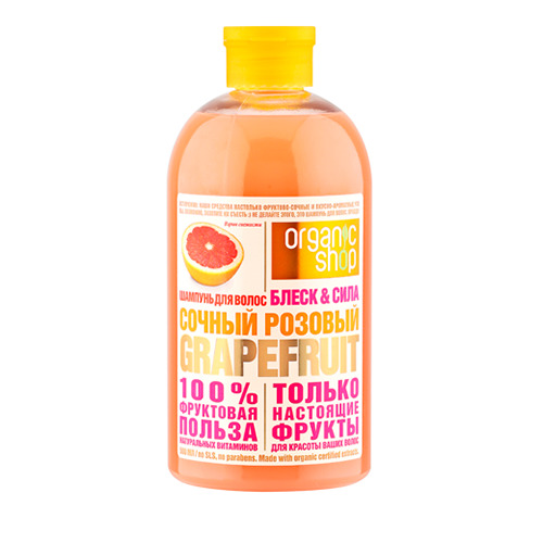 Для деликатного очищения, увлажнения, насыщения питательными веществами, укрепления, существенного улучшения состояния, восстановления жизненных сил тусклых и ослабленных волос в лаборатории косметической марки Organic Shop разработали специальный шампунь Сочный розовый Grapefruit.