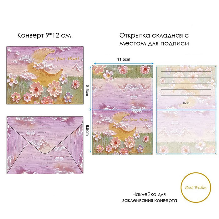 Открытка + конверт с 3D-рисунком ЦВЕТЫ И МЕСЯЦ НА РОЗОВОМ НЕБЕ