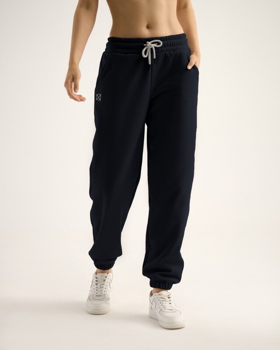 Джоггеры свободного кроя с боковыми карманами, собранные внизу. Широкий эластичный пояс со шнуром.