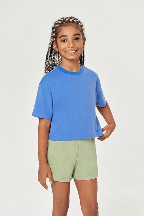 Футболка для девочек укороченная, спущенное плечо, втачной рукав. Горловина из рибаны. Плечевые швы и шов горловины спинки укреплены бейкой из основной ткани.