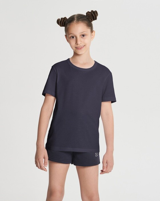 Футболка унисекс детская. Спущенное плечо. Втачной рукав. Укрепление горловины спинки и плечевых швов бейкой из основной ткани.