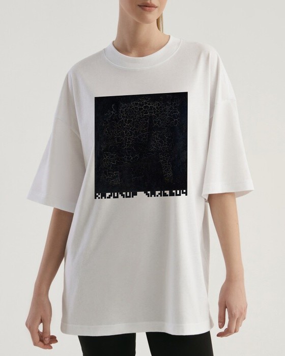 Футболка свободного силуэта. Спущенное плечо. Горловина из двух деталей, из рибаны.