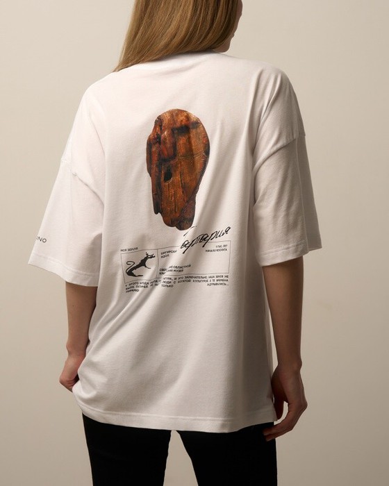 Футболка свободного силуэта. Спущенное плечо. Горловина из двух деталей, из рибаны.