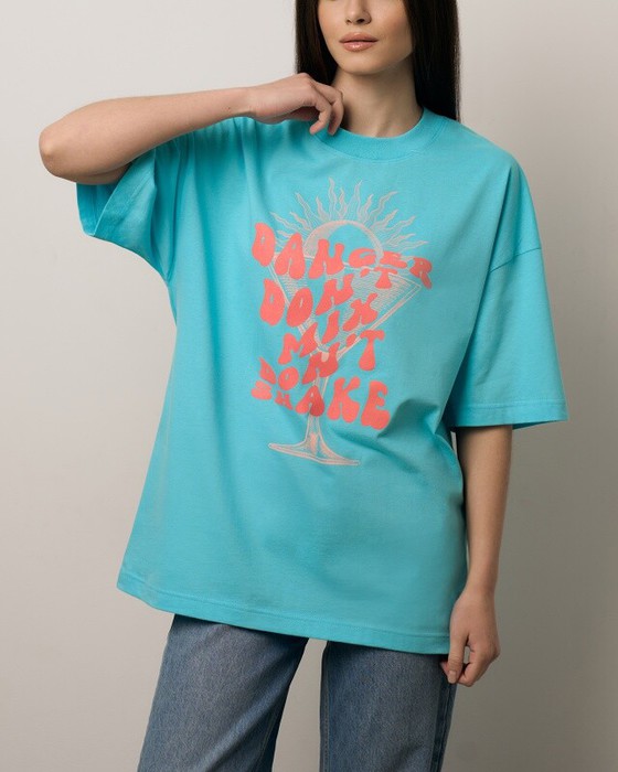 Футболка свободного силуэта. Спущенное плечо. Горловина из двух деталей, из рибаны.