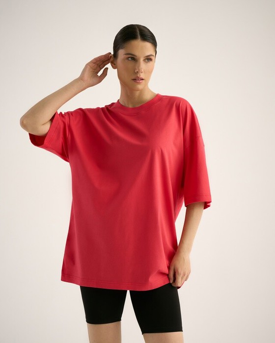 Футболка свободного силуэта. Спущенное плечо. Горловина из двух деталей, из рибаны.