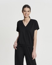 Футболка свободного силуэта. Спущенное плечо. Горловина из двух деталей, из рибаны. Укрепление бейкой плечевых швов и горловины спинки.