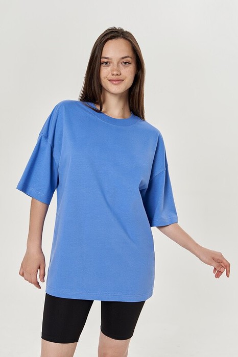 Футболка свободного силуэта. Спущенное плечо. Горловина из двух деталей, из рибаны. Укрепление бейкой плечевых швов и горловины спинки.
