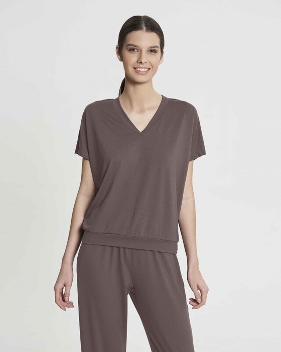 Футболка V-neck с цельнокроенным рукавом. Притачной пояс по низу футболки из основной ткани.