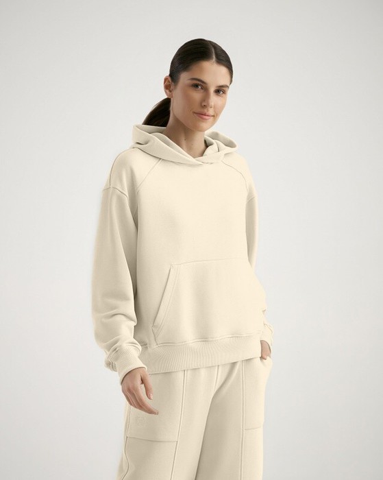 Худи женский свободного силуэта. Двойной капюшон с одним швом, притачные кокетки по переду, втачной рукав с локтевым швом. Карман "кенгуру".  Манжеты и пояс из кашкорсе.