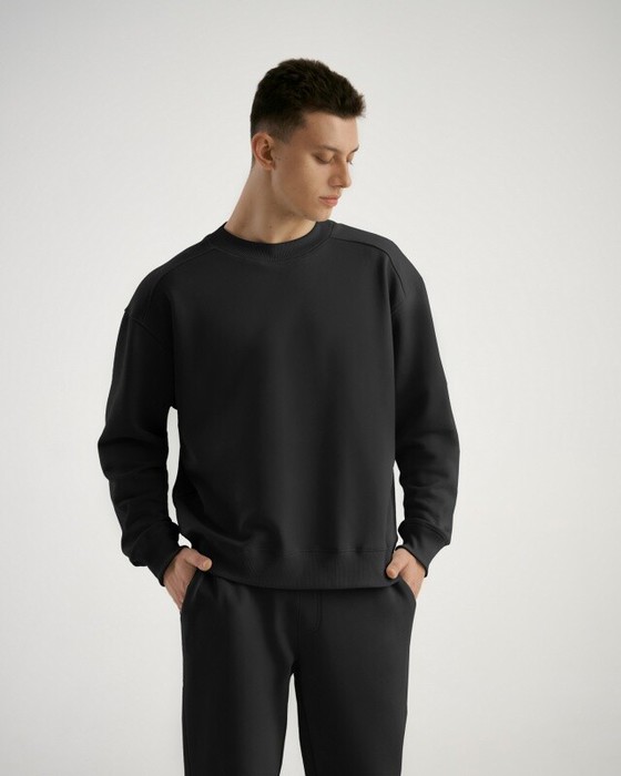 Свитшот мужской с цельнокроенной кокеткой спинки. Втачной рукав с локтевым швом. Горловина с двумя швами. Пояс, манжеты, горловина из кашкорсе