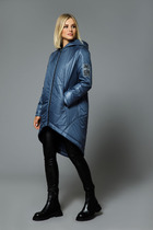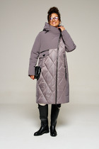 Утепленное стеганое пальто полуприлегающего силуэта-настоящий подарок для любителей классики. Изделие отрезное под линией груди с центральной застежкой на потайные кнопки. По низу рукава и по внутренней части воротника-стойки отделочная ткань светло-серого цвета. Низ рукава со шлицей на потайные кнопки. Утеплитель холкон (см.описание), плотность 100.