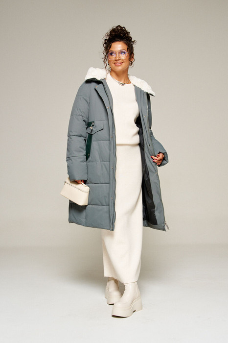 Капюшон с застежкой спереди умеренного объема. Внутренняя часть капюшона выполнена из искусственного меха, который выполняет декоративную и защитную функции, создавая дополнительное тепло и защиту от ветра и холода.