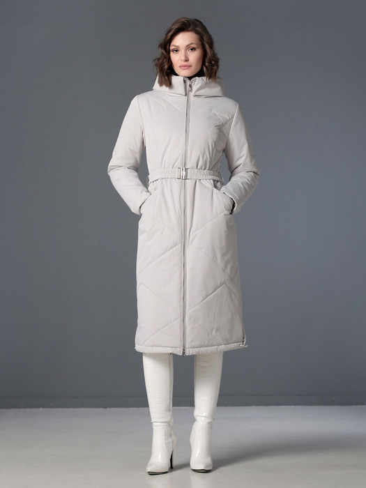 Длинное демисезонное пальто полуприлегающего силуэта с втачными рукавами и разрезами по бокам. Застежка на двухзамковую молнию позволяет расстегнуть пальто как сверху, так и снизу, что актуально при такой длине изделия для корректировки ширины шага и при  подъеме по лестнице. Воротник - стойка, переходящая в капюшон. Прорезные карманы с декоративными лИсточками удобно расположены в рельефных швах. При желании линию талии можно акцентировать съемным эластичным поясом на защелке.  Плащевая ткань имеет водоотталкивающую пропитку, которая выдержит небольшой осенний дождь или снег. Хорошо зарекомендовавший себя утеплитель  Холлофайбер, плотностью 150 гр/м, защитит от холода и  ветра. Подкладка в изделии выполнена из качественной ткани точно в цвет верха. Фантазируйте с аксессуарами, и Ваша осень будет стильной и комфортной!