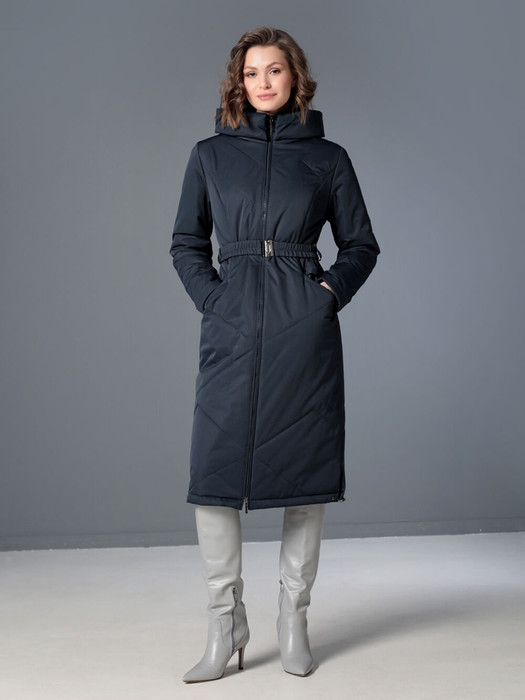 Длинное демисезонное пальто полуприлегающего силуэта с втачными рукавами и разрезами по бокам. Застежка на двухзамковую молнию позволяет расстегнуть пальто как сверху, так и снизу, что актуально при такой длине изделия для корректировки ширины шага и при  подъеме по лестнице. Воротник - стойка, переходящая в капюшон. Прорезные карманы с декоративными лИсточками удобно расположены в рельефных швах. При желании линию талии можно акцентировать съемным эластичным поясом на защелке.  Плащевая ткань имеет водоотталкивающую пропитку, которая выдержит небольшой осенний дождь или снег. Хорошо зарекомендовавший себя утеплитель  Холлофайбер, плотностью 150 гр/м, защитит от холода и  ветра. Подкладка в изделии выполнена из качественной ткани точно в цвет верха. Фантазируйте с аксессуарами, и Ваша осень будет стильной и комфортной!