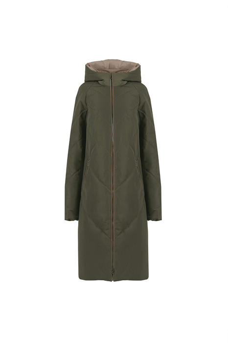 Пальто женское плащевое утепленное, стеганное на утеплителе ISOSOFT 250гр. прямого силуэта, на подкладке, с капюшоном, длиной ниже колена. Застежка на молнию. Перед с наклонными карманами, застегивающиеся на молнию. По борту и карману отделочный кант. Рукав втачной, двухшовный.