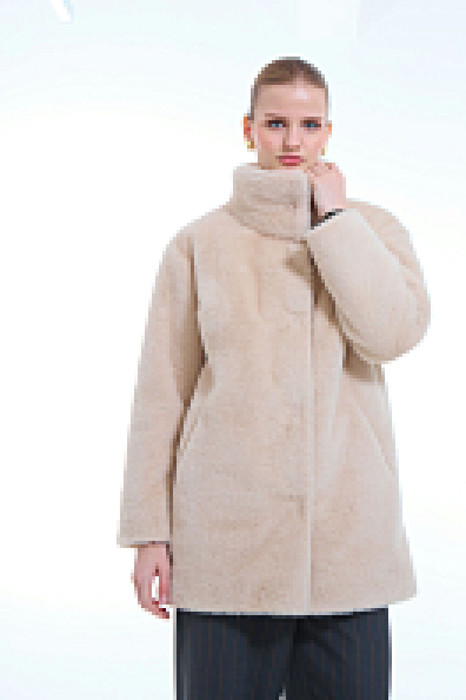 Пальто женское, прямого силуэта однобортное, длиной выше колен. Застежка на пришивные кнопки. Перед с функциональными карманами «щель». Рукав длинный, одношовный. Пальто из мехового трикотажного полотна, с воротником стойка, на подкладке.