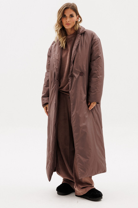 Пальто выполнено из плащевой ткани с утеплителем Isosoft. Пальто прямого силуэта, длиной до линии щиколотки. Спереди двубортная застежка на один ряд пуговиц и прорезные карманы в швах. Спинка со средним швом. Плечевой шов спущен. Воротник пиджачного типа. Рукав рубашечного покроя, двухшовный. Пальто на притачной по низу подкладке.
