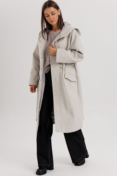 Женское пальто с капюшоном — стильная и практичная модель для прохладного сезона. Его удлинённый силуэт и мягкий  оттенок создают элегантный образ, а удобный капюшон и регулируемая талия обеспечивают комфорт в любую погоду.