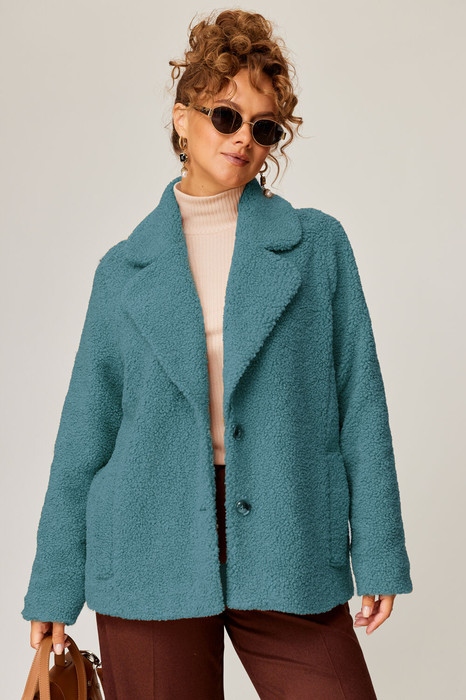 Куртка свободного силуэта выполнен из пальтовой ткани "Барашек".  Воротник пиджачного типа с закругленными концами. Застежка на две петли и пуговицы. Перед с рельефными швами, в которых обработаны карманы с листочками с настрочными концами. Рукав втачной двухшовный. Куртка на подкладке. Длина куртка - 67 см, длина рукава - 62 см.