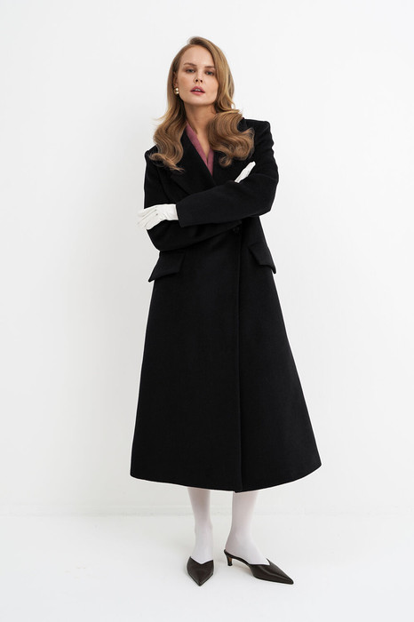 Двубортное приталенное пальто X- силуэта. Детали: полуприлегающий силуэт, перед с прорезными карманами с клапанами, перед и спинка с талиевыми вытачками, спинка со средним швом и шлицей, застежка на петли и декоративные пуговицы, втачные длинные рукава, пальто на подкладке