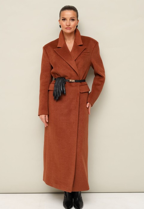 Демисезонное пальто прямого силуэта, выполнено из качественной пальтовой ткани. Воротник пиджачного типа с отложными лацканами. Двубортная застёжка на потайные пришивные кнопки. Слегка удлиненный плечевой шов. Спереди обработаны прорезные карманы в рамку с клапанами и нагрудный прорезной карман с листочкой. Рукава втачные, двухшовные. Спинка со средним швом, переходящим в шлицу. Пальто на подкладке.