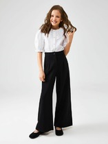 Трикотажные брюки прямого силуэта. Пояс на резинке по спинке с дополнительной встроенной утяжкой на резинку с петельками. По переду боковые карманы и застрочены стрелки. Имитация застежки, гульфика. По правой спинке имитация прорезного кармана с листочкой. По низу изделия в боковых швах располагаются шлицы