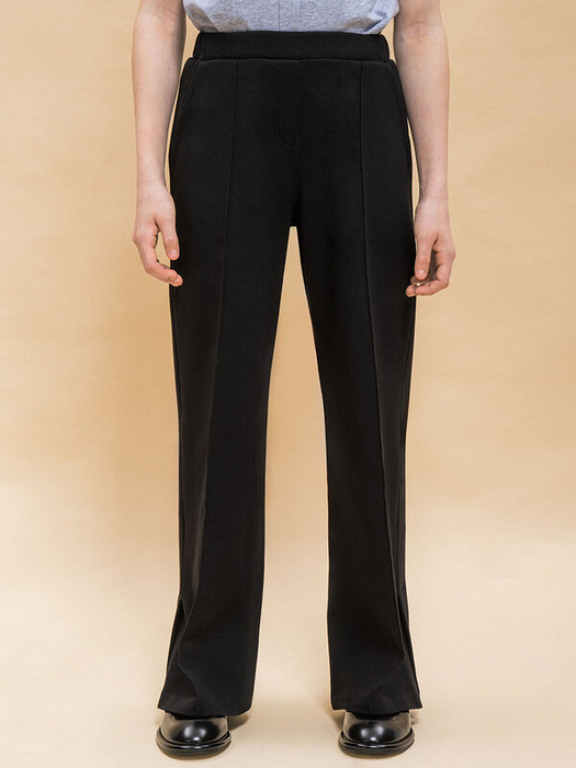 Трикотажные брюки прямого силуэта. Пояс на резинке по спинке с дополнительной встроенной утяжкой на резинку с петельками. По переду боковые карманы и застрочены стрелки. Имитация застежки, гульфика. По правой спинке имитация прорезного кармана с листочкой.  По низу изделия в боковых швах располагаются шлицы