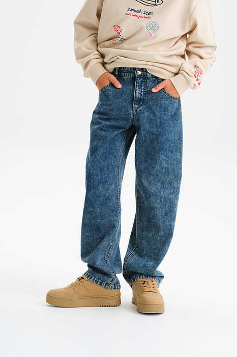 Прямые джинсы на флисе для мальчиков выполнены из плотного денима, состоящего из хлопка и полиэстера. Такая ткань обеспечивает прочность и долговечность изделия, а также сохраняет форму после стирок. Модель имеет классический прямой крой, удобные карманы и застежку на молнию и пуговицу. Джинсы подходят для повседневной носки, школы и активного отдыха.