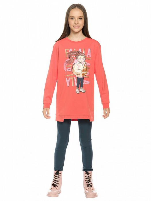 Комплект для девочек туника и лосины. Туника О силуэта со слегка спущенным плечом и манжетами из основной ткани. Низ изделия обработан двумя разноуровневыми манжетами. Принт стилизованный прототип героини истории. Вот она в кроссах, джинсах и металлизированной куртке. Копирайт с золотым металликом ФАЛАЛА. Классические длинные лосины.