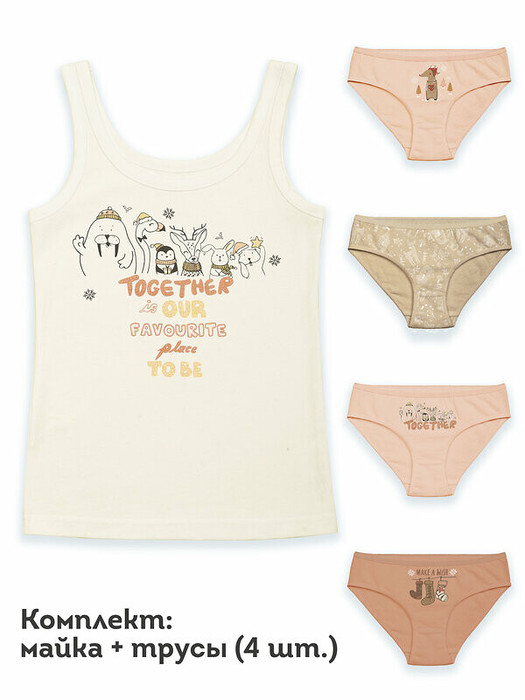 Комплект белья для девочки из хлопка. В набор входит бельевая майка на широких лямках и трусы слипы 4 штуки.  Классическая майка на широких лямках и трусики с комфортными резинками по ногам и нарядной резинкой с фестонным краем по талии - идеально подходит для ребенка любого возраста. Пошив высокого качества, аккуратные швы, которые не доставят дискомфорт ребенку. Комплект подходит для повседневной носки дома, как одежда для сна, для занятия спортом.
