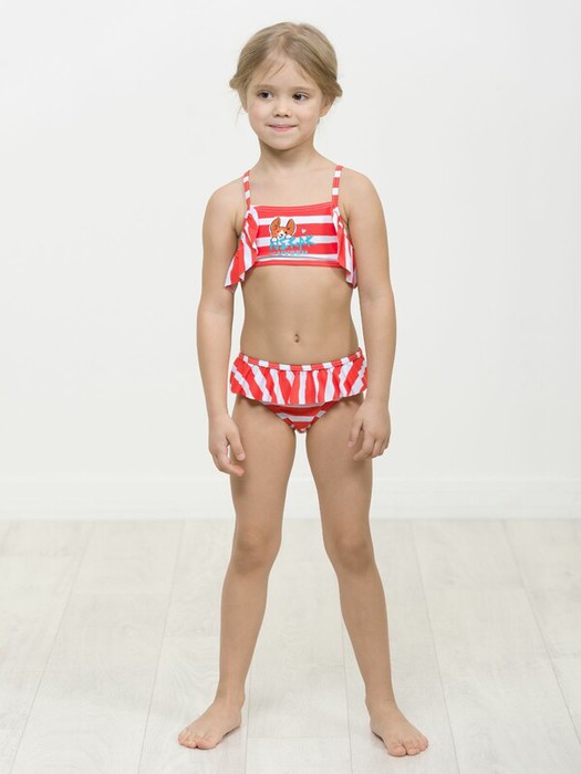 Раздельный купальник для девочек. Верх топ с декоративной рюшей по проймам, лямки с регулировкой по длине. На подкладе. Регулировка по ширине завязками на спинке. Низ трусы с увеличенной высотой посадки. Рюша по верхнему краю, перед на подкладе.