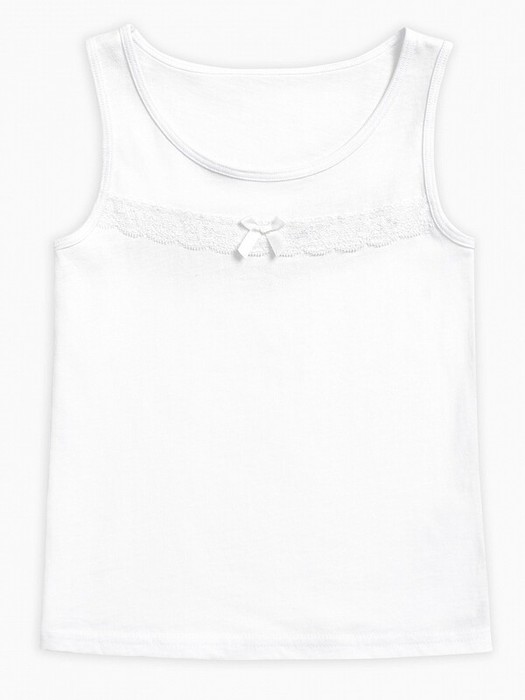 Майка для девочки. Майка изготовлена из 100% хлопка и не требует особого ухода, не линяет и не растягиваются после стирки. Классический крой, пастельные тона делают майку универсальной в носке: можно использовать как нательное белье, домашнюю одежду или как часть повседневного гардероба. Изюминка майки - декоративная лента из мягкого эластичного кружева и атласный бантик. Идеально для романтичных девочек.