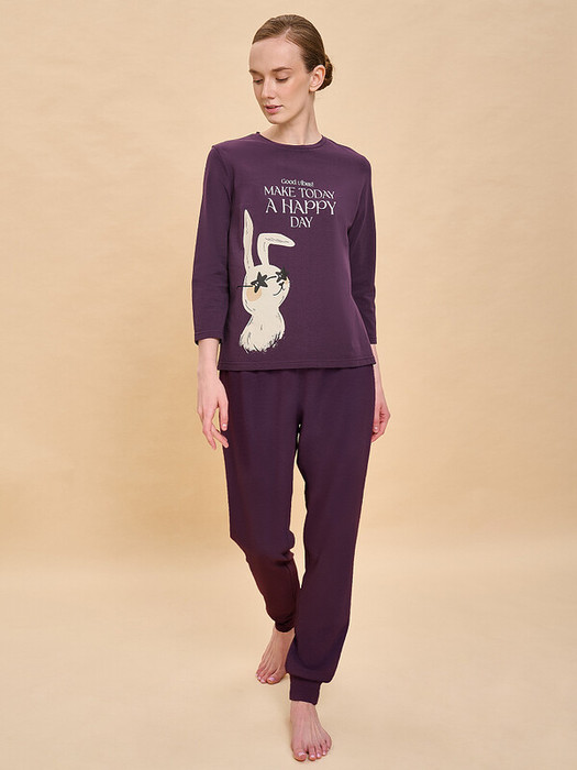 Костюм пижамный женский. В составе ткани преобладает высококачественный хлопок — комплект для сна мягкий, гипоаллергенный и хорошо пропускает воздух. В хлопковой пижаме вам будет тепло и уютно во время сна. Эластан помогает модели надолго сохранить первоначальную форму. Джемпер и брюки умеренного объёма, плечо немного спущено, рукава широкие и свободные — в пижаме очень удобно спать. В поясе брюк мягкая и широкая резинка — не перекручивается и не давит. Отделка горловины из эластичной рибаны — она не растягивается, пижаму удобно надевать и снимать. Манжеты штанин широкие, из основной ткани — не передавливают ногу. Хлопковая пижама украшена милым, «няшным» принтом в виде забавного зайчика в очках, надписи переводятся: «хорошая атмосфера», «сделай сегодняшний день счастливым» — почувствуйте себя беззаботной девчонкой. Пижамный костюм неприхотлив в уходе. Принт эластичный и мягкий, легко переносит частые стирки. Пижама женская с брюками подходит как для сна, так и просто для отдыха дома. Помните о правильном уходе за изделием: рекомендуется стирать при температуре не выше 30 °C, без предварительного замачивания, с изнанки. Это поможет сохранить качество и цвет пижамы на длительное время.